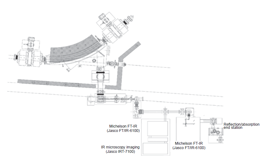 シンクロトロン放射(SR)は、VUVや軟X線(SX)領域だけでなく、赤外線(IR)やTHz領域においても優れた性能(高輝度・高フラックス)を発揮します。BL6Bは、IRおよびTHz領域をカバーしています。1985年に建設された以前のビームラインであるBL6A1は、IR-SR研究の先駆けとなりました。このビームラインは2003年度末に運用を終了し、2004年度に新しいIR/THzビームラインであるBL6B(IR)が建設されました。図1に示すように、第6偏向電磁石ダクトを含むフロントエンド部分は、マジックミラーを用いて受光角(215(H)×80(V)mrad2)がより広いものへと置き換えられました。このエンドステーションには2つのマイケルソン干渉計が設置されており、 うち1台は(Bruker Vertex70v)は、30~20,000 cm-1 = 4 meV ~ 2.5 eV)という広いスペクトル領域をカバーしているため、大型試料(最大数 mm)の反射・吸収分光測定や、微小試料(最大 数十 μm)のIR/THz顕微測定を行うことができます。反射・吸収分光測定用に、最低温度4Kの液体ヘリウム流式クライオスタットが設置されています。もう1台の干渉計(Jasco FT/IR-6100)は、350~15,000 cm-1 = 45 meV ~ 1.8 eV)の波数範囲をカバーしており、2014年度より赤外顕微イメージング測定が可能となっています。また、ダイヤモンドATRプリズムを用いたATR測定も行うことができます。
