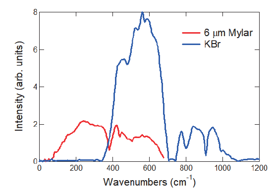 Fig. 2. Obtained intensity spectra with the combination of a light source (UVSOR), detector (Si bolometer), and interferometer (Bruker Vertex70v) with different beamsplitters (6 μm Mylar and KBr). (Only low energy side is shown.)