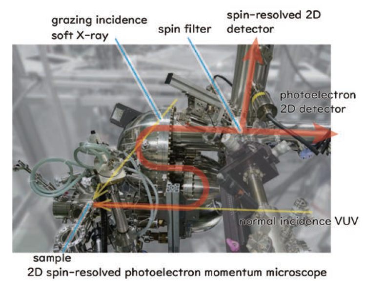 固体表面における高輝度軟X線を必要とする様々な分光研究のために、可変刻線間隔平面回折格子を備えた可変偏角Monk-Gillieson分光器を装備したビームラインBL6Uが建設されました。アンジュレータ放射と洗練された分光器設計(入射スリットレス構成および可変偏角機構)を組み合わせることで、単一の回折格子を使用しながら、40~500 eVの光子エネルギー範囲をカバーし、10,000以上の分解能と1010光子/秒以上の光フラックスを実現しています。図1は、Siフォトダイオードを用いて測定した分光器の透過スペクトルの例を示しています。出口スリット幅は30μmに設定されており、これは80eVにおける理論分解能10000に相当します。BL6U(SPECS KREIOS 150 MM)には、微視的な視野を持つ3次元運動量空間で分解能を持つ光電子分光法のための新しい運動量顕微鏡実験ステーションが建設されました。kx/kyおよびkzにおいて、0.01 Å-1の運動量分解能が達成されています。ARPESにおいて、50 nmの空間分解能、9 Kでの20 meVのエネルギー分解能、および2 μmの視野が実証されました。この実験ステーションは、表面原子サイト、薄膜、分子吸着体、およびバルク結晶の電子構造の解析を専門としています。この手法により、従来のARPES用半球形アナライザーでは困難であった、μmサイズの結晶のフェルミ面の直接観測が可能となります。