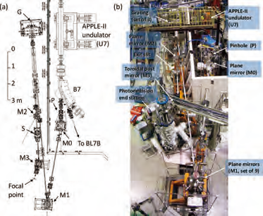 Fig. 1. SAMRAI beamline [(a), (b)] consisting of an APPLE-II type undulator (U7), a modified Wadsworth type monochromator (M0-S), and a high-resolution photoemission analyzer at the focal point. The monochromator has five major optical components: two plane mirrors (M0 and M1) with water cooling, one set of three spherical gratings (G), an exit slit (S), and one toroidal refocusing mirror (M3). (c) Example of flux intensity versus photon energy [1].